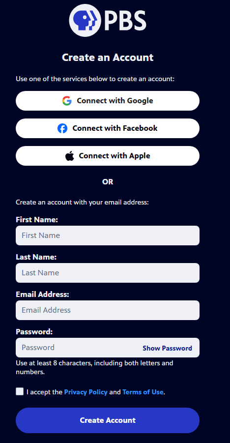 First, we’re gonna head to the account creation page here. Your Login is going to give you access to both Pbs.org and the PBS app. If you want to use PBS Passport, which gives you some extended offerings for $5 a month, that option is there for you too.
